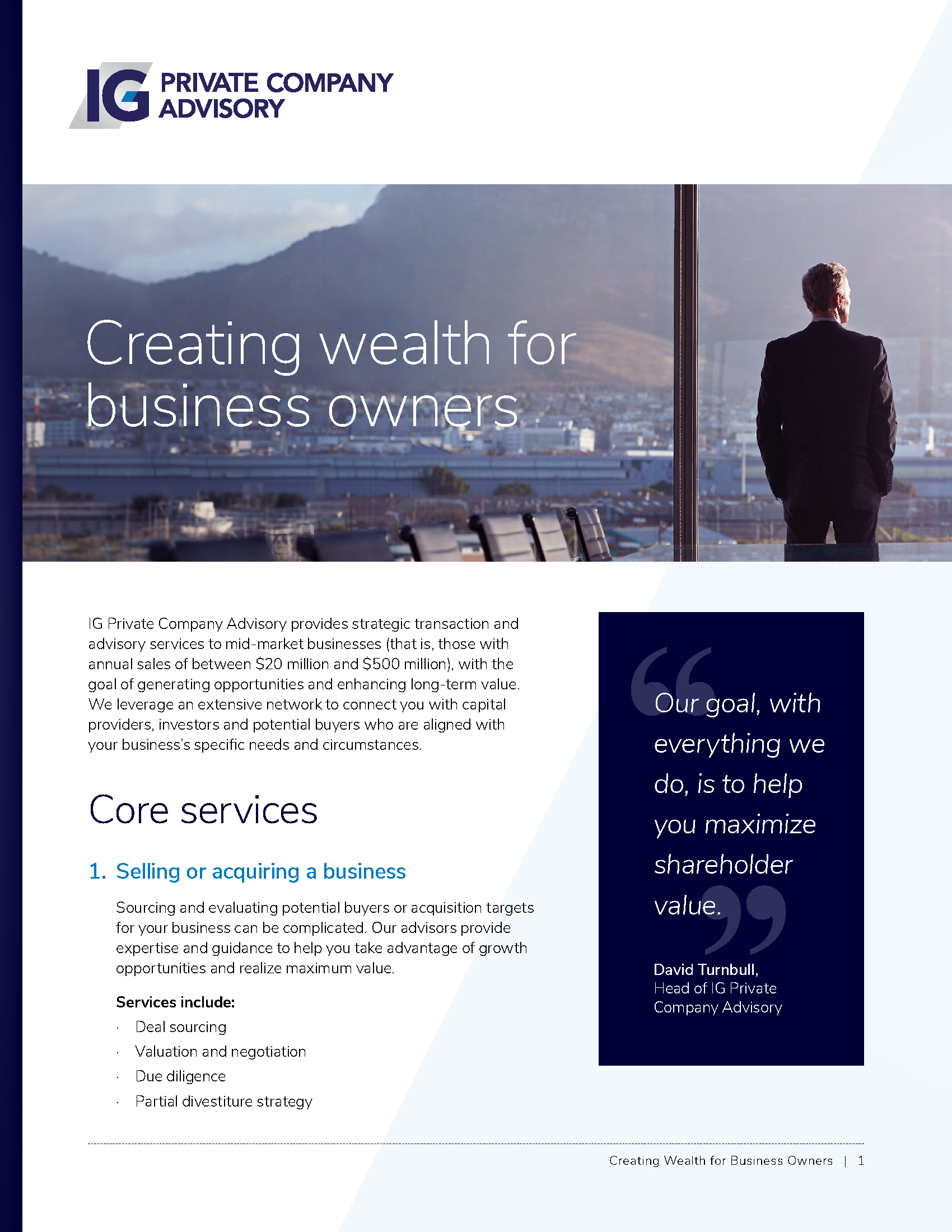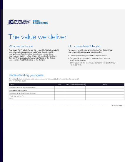 Mutual funds and investment products and services are offered through the Mutual Fund Division of IG Wealth Management Inc. (in Quebec, a firm in financial planning). Additional investment products and brokerage services are offered through the Investment Dealer, IG Wealth Management Inc. (in Quebec, a firm in financial planning), a member of the Canadian Investor Protection Fund.